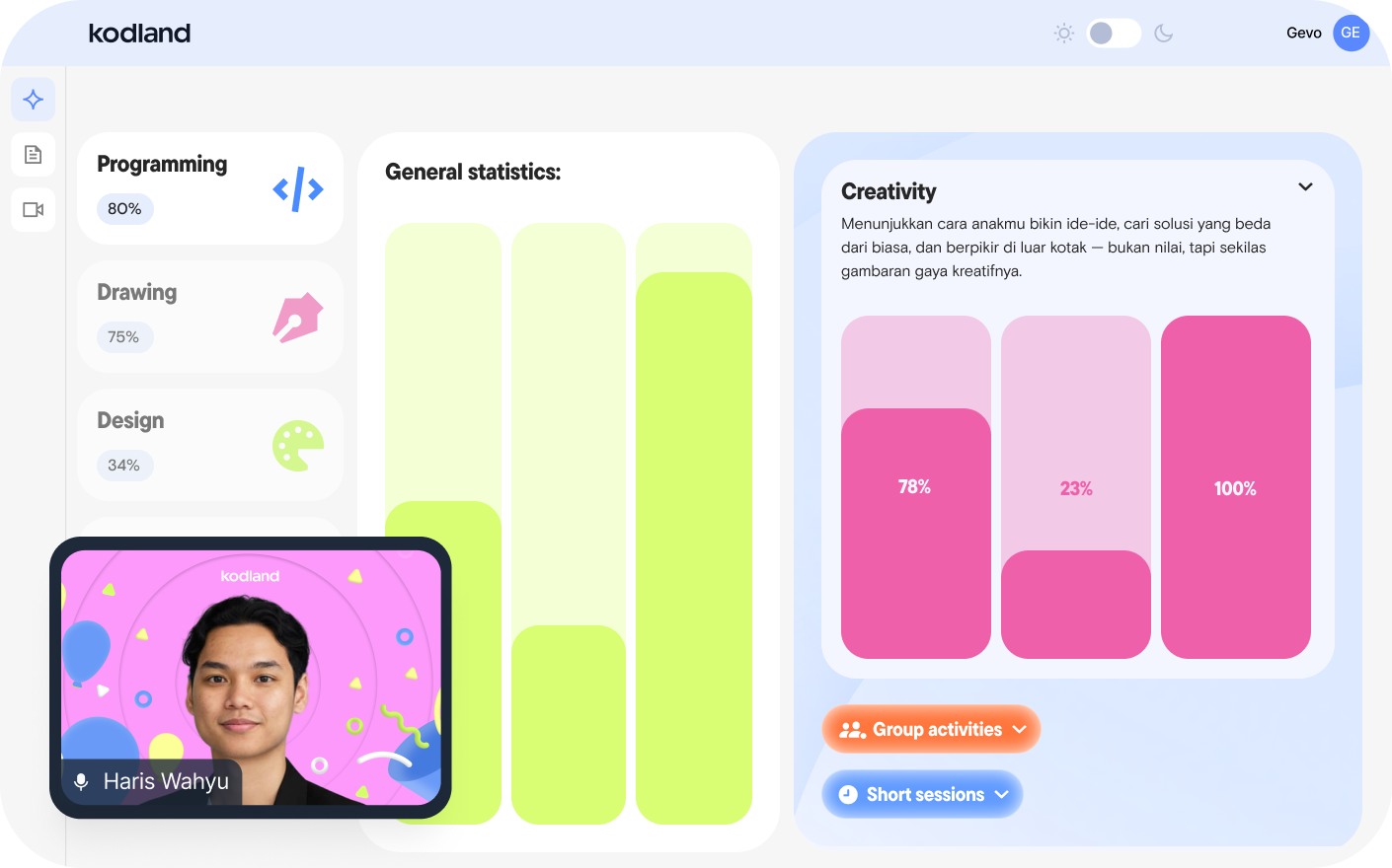 Pelajaran diadakan di platform kami dalam kelompok kecil dengan seorang tutor. Pembelajaran berbasis praktik: anak-anak menerapkan konsep baru secara langsung dalam proyek nyata.