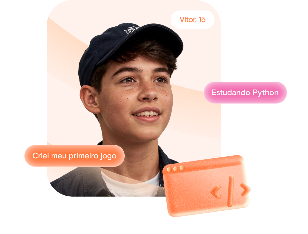 "Eu estava muito animado para começar este curso na Kodland. Graças a eles, consegui fazer novos amigos e descobrir muitas coisas novas que eu nem sabia que existiam, como por exemplo os jogos clicker!"