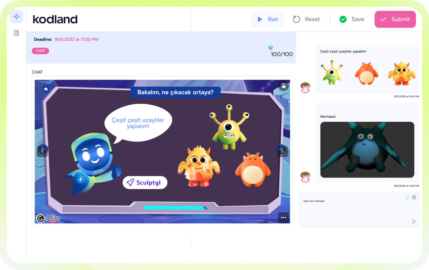 Dersler platformumuzda, eğitmen eşliğinde, küçük gruplarda canlı olarak gerçekleşir. Öğrenme tamamen uygulamalıdır: çocuklar yeni bilgileri gerçek projeler üzerinde çalışarak hemen kullanır.